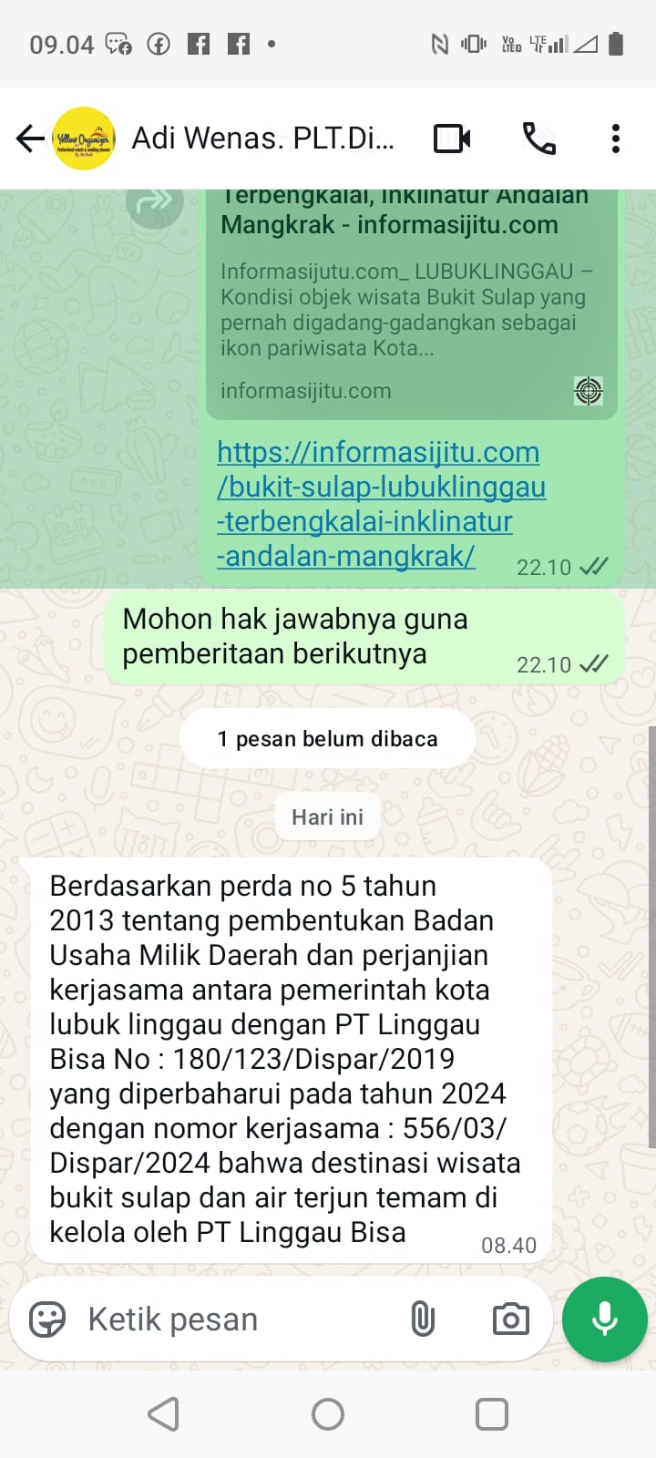 “Berdasarkan Perda Nomor 5 Tahun 2013 tentang pembentukan BUMD, dan perjanjian kerjasama terbaru tahun 2024 dengan nomor 556/03/Dispar/2024, destinasi wisata Bukit Sulap serta Air Terjun Temam dikelola oleh PT Linggau Bisa. Kami dari Dispar hanya melakukan monitoring, evaluasi, pembinaan, dan pengawasan. Untuk tindak lanjut tetap kembali ke pihak pengelola,” terangnya.