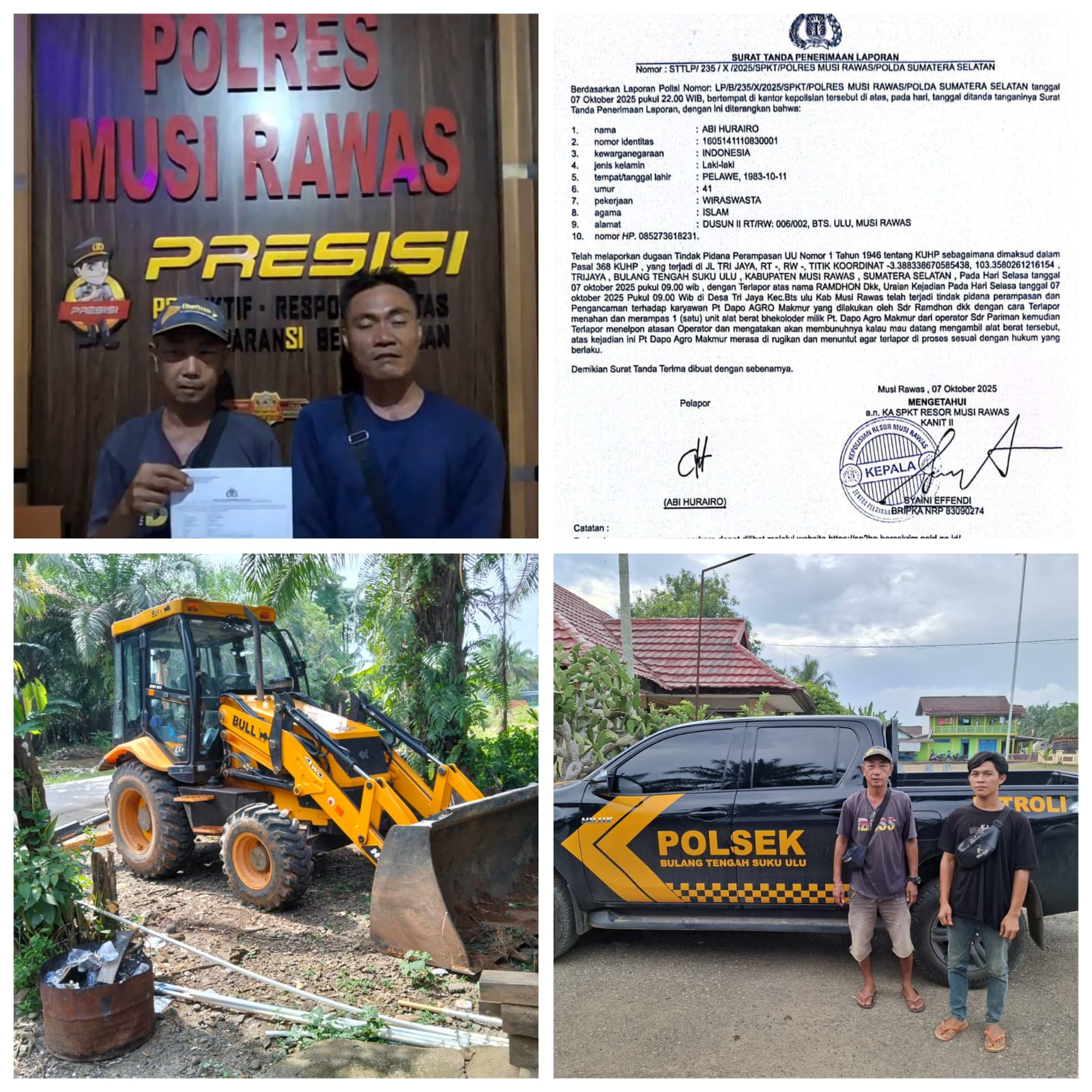 Berdasarkan laporan polisi nomor: LP/B/235/X/2025/SPKT/Polres Musi Rawas/Polda Sumatera Selatan Tanggal 07/Oktober/2025/pukul 22: WIB, bertempat dikantor kepolisian tersebut diatas,pada hari,tanggal ditanganinya surat tanda penerima laporan , dengan ini diterangkan bahwa: Nama: Abi Hurairo. Nomor Indentitas:1605141110830001. Kewarnegaraan : Indonesia. Jenis kelamin: Laki- Laki. Tempat/ Tanggal lahir: Pelawe,1983-10-11. Umur : 41. Pekerjaan: Wiraswasta. Agama: Islam. Alamat: Dusun II RT/ RW 006/ 002,BTS ulu, Musi Rawas. No HP 085273618231.