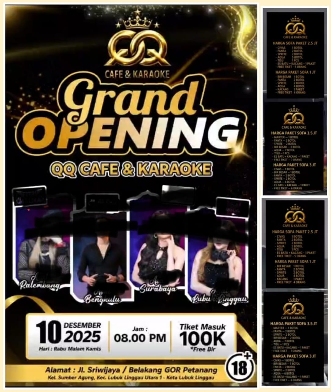 LUBUKLINGGAU – Rencana Grand Opening Cafe QQ dan Karaoke yang dijadwalkan pada 10 Desember 2025 di Jalan Sriwijaya/Belakang GOR Petanang, Kelurahan Sumber Agung, Kecamatan Lubuklinggau Utara 1, Kota Lubuklinggau, Sumatera Selatan, menuai gelombang penolakan keras dari kalangan tokoh agama. Promosi acara yang viral di media sosial, menampilkan pesta DJ dengan beragam paket minuman beralkohol hingga jutaan rupiah, dinilai sarat potensi maksiat.