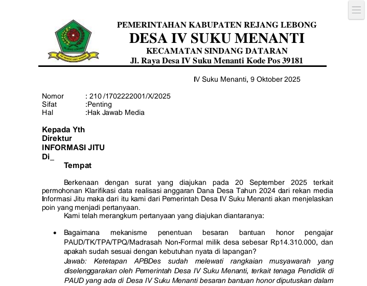 Rejang Lebong – Pemerintah Desa IV Suku Menanti, Kabupaten Rejang Lebong, akhirnya memberikan klarifikasi resmi pada 20 September 2025 atas permintaan informasi dari rekan media Informasi Jitu terkait realisasi anggaran Dana Desa Tahun 2024. Klarifikasi tersebut menanggapi sederet pertanyaan krusial seputar pelaksanaan kegiatan, distribusi anggaran, hingga efektivitas penggunaan dana publik di berbagai sektor pembangunan desa.