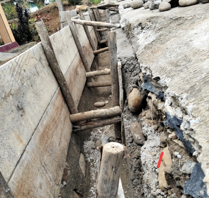 Tak hanya itu, pengerjaan drainase juga disinyalir asal-asalan. Pemadatan batu tidak merata, bagian dinding tampak menipis alias mencicup, bahkan terlihat menggunakan papan mal seadanya. Lebih parahnya lagi, bangunan drainase justru menumpang di atas cor lama milik warga yang sudah ada sebelumnya.