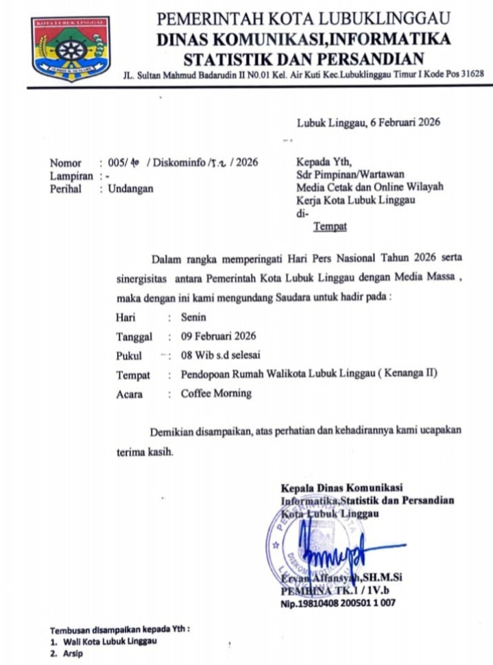 LUBUK LINGGAU – Dalam rangka memperingati Hari Pers Nasional (HPN) Tahun 2026, Pemerintah Kota Lubuk Linggau melalui Dinas Komunikasi, Informatika, Statistik, dan Persandian (Diskominfotiksan) mengundang seluruh insan pers untuk hadir dalam acara Coffee Morning.