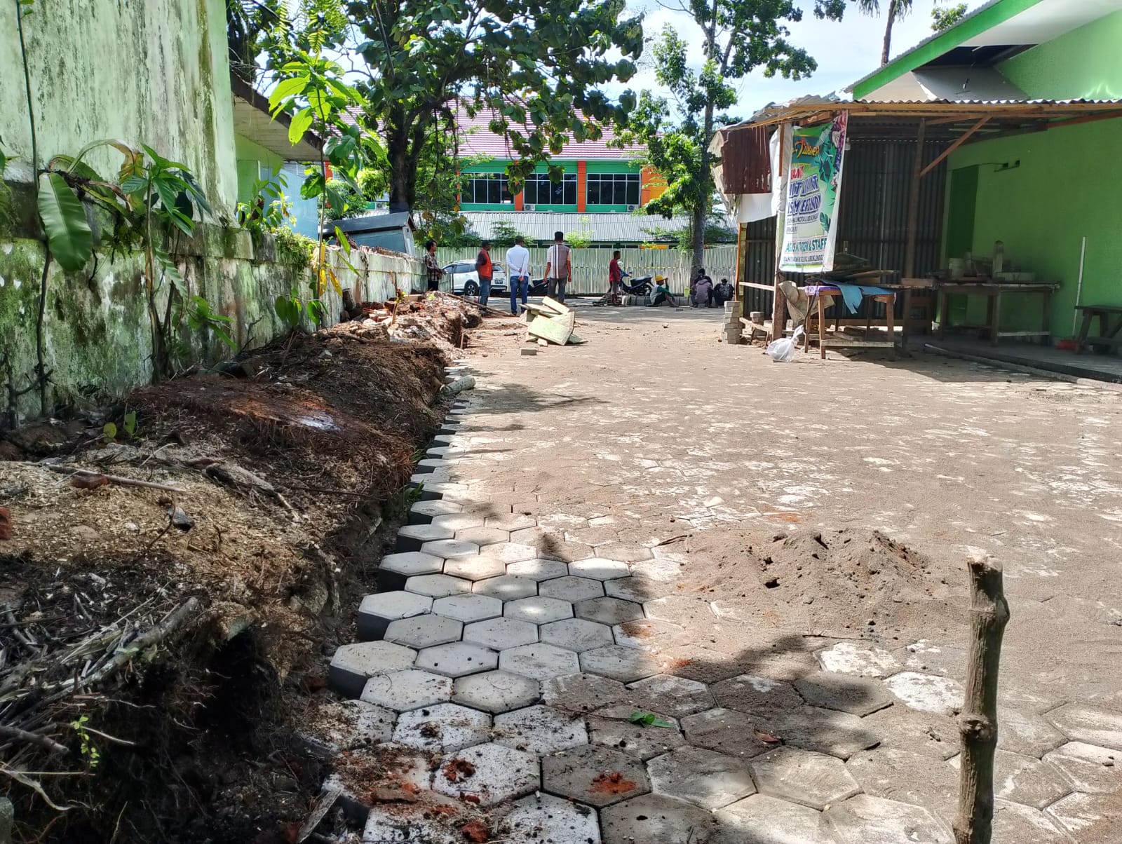 “Saya tukang harian saja pak, untuk pemasangan paving block di halaman kantin dan ada juga taman,” jelasnya singkat.